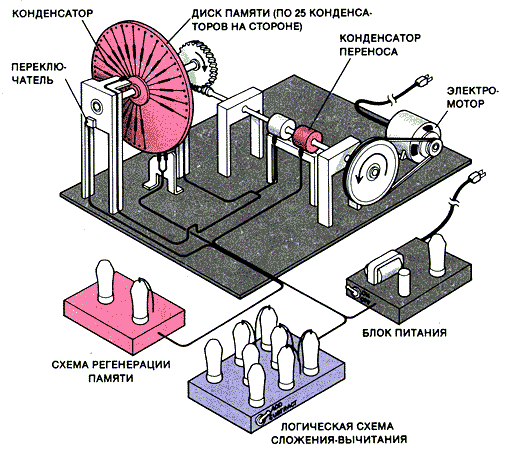 Атанасов в день своего 80-летия в Университете шт. Айова в 1983 г. На переднем плане барабан запоминающего устройства - единственная сохранившаяся часть компьютера "АВС". Каждое кольцо конденсаторов на барабане хранило одно число, состоящее из 50 двоичных разрядов, или битов. Всего барабан мог хранить 1500 бит. В наши дни полная память даже простого калькулятора, встроенного в наручные часы, такие как на руке Атанасова, может быть в 10 раз более емкой.Сначала этот вечер не выглядел особенно обещающим. На самом деле Атанасов был так раздосадован, что, покинув лабораторию, сел в машину и поехал на большой скорости по шоссе, целиком сконцентрировав свое внимание на вождении, чтобы развеяться и отвлечься от неприятных переживаний. Через несколько часов он очутился в 200 милях от дома, в штате Иллинойс. Он остановил машину у ярко освещенного придорожного бара, чтобы чего-нибудь выпить."В тот день было ужасно холодно и на мне было очень тяжелое зимнее пальто, - вспоминал он в своих свидетельских показаниях на суде. - Я снял его, повесил, сделал заказ официанту и, когда он принес спиртное, я вдруг ощутил, что успокоился и обратился опять к своим размышлениям о вычислительных машинах. Я не знаю, почему моя голова вдруг заработала и почему она не работала до этого, но все как-то прояснилось, я думал четко и спокойно... Наверное, я выпил две рюмки, прежде чем понял, что мне приходили в голову очень хорошие мысли и я существенно продвинулся вперед".И действительно, мысли оказались очень важными. Вместо механических устройств Атанасов решил применять электронные переключатели (электронные устройства, управляющие прохождением электрических сигналов), с помощью которых должны были выполняться функции управления и арифметические операции в компьютере. В этом смысле ему принадлежит первенство. До этого ни одна машина, предназначенная для решения сложных математических задач, не была основана на электронике.Он пришел также к убеждению, что его цифровая машина должна оперировать двоичными числами и что операции над этими числами будут осуществляться в соответствии с правилами логики, а не прямым подсчетом (см. рисунок ниже). В тот же вечер Атанасов решил и важную частную проблему, касающуюся способа хранения в памяти двоичных чисел. Он и раньше подумывал над идеей воспользоваться конденсаторами, устройствами, накапливающими и хранящими электрический заряд, в качестве запоминающих элементов компьютера. Например, положительный заряд на каком-то одном выводе конденсатора мог представить цифру 1, а отсутствие заряда соответственно 0. Проблема заключалась в том, что конденсаторы постепенно теряют свой заряд. Расслабившись в придорожном баре, Атанасов придумал способ обойти это затруднение, воспользовавшись так называемой регенерацией памяти. Периодически заряд конденсатора должен был восстанавливаться таким образом, что, если он был, скажем, в положительном состоянии, то он и дальше в нем оставался, и его положительный заряд со временем не изменялся и не доходил в конце концов до нуля. Приняв эти решения, вспоминает Атанасов, "поздно вечером я опять сел в машину и теперь уже медленно поехал домой".