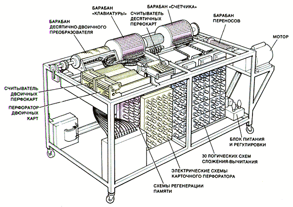 Однако на самом деле в период между 1937 и 1942 гг., т.е. за несколько лет до того, как были созданы упомянутые машины, Атанасов сконструировал и построил два сравнительно небольших электронных компьютера. Первый из низ послужил прототипом более мощной машины, которая получила название компьютера Атанасова-Берри, или сокращенно "АВС". Берри - это покойный Клиффорд Е. Берри, аспирант и ближайший помощник Атанасова, работавший вместе с ним с 1939 по 1942 г.