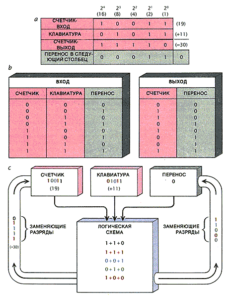 Каждая логическая схема выполняла сложение двух чисел, как в рассмотренном здесь примере (а) в соответствии с правилами, представленными в таблице (b). Допустим, нужно сложить двоичный эквивалент числа 19 в счетчике с эквивалентомчисла 11 на клавиатуре. После того как эти числа преобразованы в двоичную форму, т.е. разложены по степеням двойки (20, 21, 22, 23, или 1,2,4,8), их можно записать как 10011(16+0+0+2+1) и 01011 (0+8+0+2+1). Логическая схема начнет выполнять операцию со сложения разрядов в крайнем правом столбце (2°). При этом она определит, что сочетание разрядов в счетчике, на клавиатуре и в бите переноса - 1,1,0 соответствует третьей от конца строчке в таблице. (Исходное значение бита переноса всегда равно 0.) Согласно графе "выход" в таблице, схема (с) пошлет сигнал 0 {черный) на счетчик (где фиксируются результаты), заменяя старое значение 1. Сигнал 1 {красный) будет послан в ячейку переноса. Эта процедура эквивалентна подсчету "1 плюс 1 равно 2" при условии, что это число 2 по основанию 2 записывается как 10. Аналогичным образом схема сложит затем последовательно разряды в остальных колонках, пока не будет получен окончательный результат.Для достижения своей цели - решения системы многих уравнений со многими неизвестными - Атанасов поместил запоминающие устройства "клавиатуры" и "счетчика" уже не на диске, а на больших барабанах. Каждый барабан мог хранить 30 двоичных чисел, состоящих из 50 разрядов.Компьютер "АВС" выполнял процедуру исключения Гаусса каждый раз для двух уравнений. Их коэффициенты, закодированные предварительно на перфокартах в десятичном виде, преобразовывались в двоичную форму специально сконструированным для этого преобразующим барабаном и записывались в запоминающее устройство. Коэффициенты одного уравнения загружались в барабан счетчика, коэффициенты второго - в барабан клавиатуры. При каждом повороте барабана, занимавшем около одной секунды, логические схемы выполняли одно сложение или вычитание над двумя наборами коэффициентов. Точнее, одна логическая схема, состоящая теперь из 7 ламп, складывала или вычитала коэффициент, скажем при x1 на клавиатурном барабане с коэффициентом при x1 на барабане счетчика, оставляя сумму или разность в счетчике. В то же самое время другие логические схемы аналогичным способом обрабатывали остальные пары коэффициентов. (Такой процесс, в ходе которого ряд идентичных действий выполняется параллельно, называется векторной операцией, а компьютер, выполняющий подобные операции, - векторным процессором.) Одновременно специальные схемы регенерации памяти обновляют содержимое запоминающего устройства "клавиатуры". Позже, после того как многочисленные сложения и вычитания были выполнены и соответствующее неизвестное было исключено, компьютер "АВС" перфорировал набор оставшихся коэффициентов (в уравнении с исключенным неизвестным) на картах в двоичном виде. Эти карты хранились до тех пор, пока вновь не требовались на одном из следующих этапов вычислений. При этом специальное устройство чтения двоичных перфокарт переводило записанную на них информацию в запоминающие устройства компьютера. Когда значения всех неизвестных были вычислены в двоичном виде, устройство чтения десятичных карт осуществляло обратную операцию, переводя двоичные данные в обычные десятичные числа.