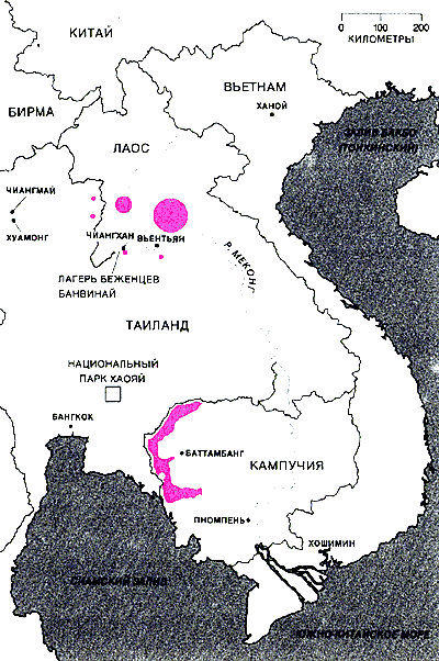 На карте в цвете обозначены районы, якобы подвергавшиеся химическим нападениям. В лесу национального парка Хаояй трое из авторов статьи (Акратанакул, Меселсон и Сили) обнаружили множество пчелиных фекалий, очень похожих на пробы и описания желтого дождя. Все трое наблюдали фекальный ливень в деревне Хуамонг. Один из нас (Гиллемин) изучил результаты 217 опросов, 193 из которых были проведены среди монгов-беженцев с января 1979 г. по август 1983 г. Описание цвета химических осадков остается неизменным почти у всех опрошенных, но рассказы о средствах химических нападений и описания симптомов вызванных ими заболеваний, сильно различаются.