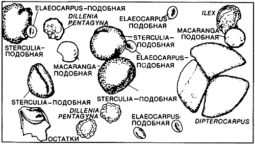 Пыльцевые зерна составляют большую часть как желтого дождя, так и фекалий пчел. На микрофотографии (Х 950) слева изображена пыльца пробы желтого дождя из Лаоса, полученной Агентством телевизионных новостей (АВС News). На микрофотографии справа показана пыльца, содержащаяся в фекалиях медоносных пчел Apis dorsata. Идентификация и классификация пыльцы дана в схематических картах. С помощью этих микрофотографий можно выделить три типа пыльцы желтого дождя, соответствующих пыльце в фекалиях пчел: Elaecarpus-подобные зерна - самые маленькие и самые многочисленные; Sterculia-подобные зерна, имеющие сетчатую поверхность, и зерна Dilenia pentagyna с неровной поверхностью.Как меняется внешний вид пыльцевых зерен после переваривания в организме пчелы? Как правило, более старые пчелы собирают пыльцу и запасают ее в гнездах. Затем ее съедают молодые взрослые пчелы, при этом большая часть содержимого зерна, включая жиры и белки, усваивается пчелой. Однако внешняя оболочка зерна - экзин - не усваивается пчелой и переходит в фекалии. Пищеварительная система пчелы в очень малой степени влияет на морфологические признаки, используемые для идентификации пыльцы.Один из авторов (Новик) с ассистентом Я. Битнером осуществили анализ пыльцы в канадских пробах и в пробе желтого дождя, полученной от Агентства АВС News. Результаты этой работы позволяют сделать три важных вывода. Во-первых, растения всех таксонов, идентифицированных с помощью пыльцы желтого дождя, распространены в Юго-Восточной Азии, и их среда совместима с экологическими условиями вблизи районов, якобы подвергавшихся химическим нападениям. Во-вторых, многие типы пыльцы, выделенные в пробах желтого дождя, соответствуют типам пыльцы, обнаруженным у пчел и в фекалиях пчел в Таиланде, а также в пробах меда, собранного в горах северного Таиланда и в районах Таиланда, пограничных с Лаосом. Присутствие пыльцы желтого дождя как у пчел, так и в их фекалиях подтверждает то, на что указывали результаты цветной реакции на белок: пыльца была действительно собрана медоносными пчелами Юго-Восточной Азии. В-третьих, при анализе проб желтого дождя не было обнаружено и двух пятен, даже находившихся рядом на одном и том же листе, которые имели бы идентичное смешение типов пыльцы. Каждое пятно сильно отличалось от другого. Такое разнообразие структуры пыльцы, при котором одно пятно отличается от другого, характерно для фекалий пчел и невозможно при использовании смеси, приготовленной человеком. Таким образом, лабораторный анализ проб желтого дождя, в том числе пробы, полученной от Агентства АВС News, которая, как утверждалось, содержит трихотецены, показал, что желтый дождь есть продукт жизнедеятельности пчел.