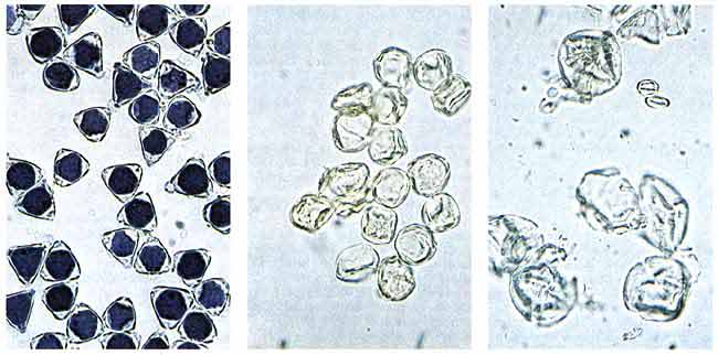 Присутствие белка в пыльцевых зернах можно обнаружить с помощью красителя "кумасси ярко-синего". Пчелы усваивают белок съедаемой ими пыльцы, поэтому пыльцевые зерна в их фекалиях не окрашиваются красителем. Пыльцевые зерна на микрофотографии (Х 520) слева были запасены, но не съедены пчелой A. dorsata, они окрасились в насыщенный синий цвет. На микрофотографии в середине изображены пыльцевые зерна фекалий A. dorsata, после обработки их красителем они не окрасились в синий цвет. На третьей микрофотографии показаны пыльцевые зерна, содержавшиеся в пробе желтого дождя, полученной Агентством АВС News. Ни одно из них не окрасилось красителем; на основании этого можно сделать предположение, что пробы желтого дождя представляют собой фекалии пчел, обитающих в Юго-Восточной Азии.Кроме того, мы провели анализ пыльцевых зерен желтого дождя на присутствие в нем белка. Известно, что при прохождении через пищеварительную систему пчелы элементы пыльцы, включая белок, перевариваются в ней. В пыльце же, не потреблявшейся пчелой, белок остается целым. Такая пыльца окрашивается в насыщенный синий цвет в присутствии красителя "кумасси ярко-синий". Мы установили, что в такой цвет окрашиваются недавно собранная пыльца, а также пыльца, взятая из пчелиных гнезд и непосредственно у пчел, что указывает на высокое содержание белка. Напротив, большая часть пыльцевых зерен в фекалиях пчел не окрашивается кумасси. Важно отметить, что пыльца, обнаруженная в наших пробах желтого дождя, также не окрашивалась. Таким образом, если допустить вопреки указанным фактам, что действительно велась химическая война с применением желтого дождя, то придется вообразить противника, удивительно изощренного в своих действиях: он производит оружие путем отбора пыльцы, прошедшей через пищеварительный тракт пчел.