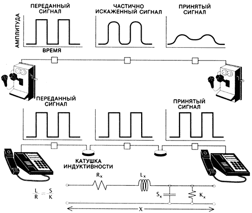 Проблема, требовавшая скорейшего решения, состояла в следующем: как предохранить высокочастотный сигнал от искажения при его передаче по кабельной линии связи. Некоторые искажения неизбежны, например те, которые обусловлены электрическим сопротивлением, из-за которого часть энергии сигнала превращается в бесполезное тепло. Искажение может быть также обусловлено индуктивностью и емкостью цепи, приводящими к тому, что энергия сигнала кратковременно передается магнитному или электрическому полю соответственно. Искра, возникающая, когда вилку шнура электронагревательного прибора вынимают из розетки, обусловлена индуктивностью цепи - это энергия, накопленная в магнитном поле, существовавшем в цепи, когда по ней протекал электрический ток. Конденсатор же накапливает энергию в электрическом поле, которое может сохраняться некоторое время даже после того, как он отключен от зарядившего его источника. Вот почему так опасно, например, открывать только что отключенный от сети телевизор, в котором имеются высоковольтные конденсаторы.