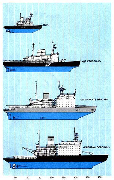 Четыре типа ледоколов изображены в одном масштабе. Ледокол "Эйл" предназначен для прокладки каналов во льдах и буксировки судов в реках, заливах и озерах с умеренной степенью замерзания (Великие озера, Балтийское море). "Де Гроселье" - представитель ледоколов класса R морской береговой охраны Канады работает на реке и в заливе Св. Лаврентия, а летом в Арктике. "Алмиранте Иризар" построен в Финляндии для Аргентины и используется в Антарктике как ледокол и как научное судно. "Капитан Сорокин" - советский ледокол. Нос ледокола имеет характерный скос и утолщенную облицовку. Это позволяет ледоколу вползать на лед, который ломается под тяжестью судна.Одним из возможных решений этой проблемы является создание ледоколов с тремя кормовыми гребными винтами - одним средним и двумя бортовыми. Но и при таком расположении гребные винты могут выходить из строя, как это было, например, у двух ледоколов класса "Полар" морской береговой охраны США. Поломка винтов, по-видимому, происходила в связи с тем, что ледоколы, на которых они были установлены, предназначались как для прокладки каналов во льдах Арктики, так и для снабженческих и исследовательских целей в Антарктике, и поэтому суммарная мощность на валах была чрезмерно большой для корпусов данного размера. В результате этого корпуса судов хронически вибрировали. Эффективная мощность каждого из этих ледоколов 60 тыс. л.с. (больше,чем на любом неатомном ледоколе): 42 тыс. л.с. развивает газотурбинный двигатель, который приводит в движение основной вал при ходе во льдах, и 18 тыс. л.с. - дизель-электрическая установка, работающая на бортовые винты, когда судно идет в свободной воде, например при переходе в Антарктику.