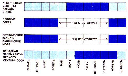 Темная зона соответствует периоду плавания ледоколов.Самым мощным ледокольным флотом располагает СССР. Это единственная в мире страна, имеющая атомные ледоколы, которые работают круглый год. Даже многие советские торговые, в том числе и многоцелевые, контейнерные суда (примерно соответствующие арктическому классу 2), предназначены для активного ледового плавания и способны самостоятельно продвигаться в умеренных льдах. (Торговые суда многих других стран имеют только незначительное ледовое подкрепление.) Как правило, дедвейт (валовая грузоподъемность) этих судов равен 18 тыс. т, они имеют малую осадку и оснащены пневматической омывающей системой. Суда такого типа способны проходить по крупным сибирским рекам, впадающим в моря Арктики.