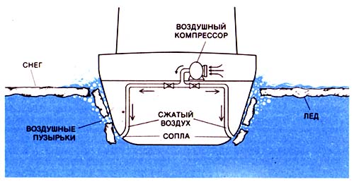 Конструктивные особенности канадского ледокола "Канмар Кигориак", предназначенного для защиты буровых платформ в море Бофорта. Ледокол имеет ложкообразную форму носа, специальный выступ и один гребной винт с защитной насадкой. Считается, что такая форма носа обеспечивает минимальные затраты энергии при разрушении тонкого льда. Заостренный выступ, врезаясь в лед, облегчает поворот судна. Защитная насадка предотвращает фрезеровку льда винтом. Ледокол, кроме того, имеет увеличенную площадь руля.Наличие носовых и кормовых гребных винтов повышает маневренность ледокола и дает больше шансов не застрять во льдах. На старых ледоколах все еще практикуется и такой способ борьбы с заклиниванием, как раскачивание судна с борта на борт путем перекачки жидкого балласта или горючего из одной бортовой креновой цистерны в другую. Используя подобным образом дифферентные цистерны в носовой и кормовой оконечностях, можно обеспечить раскачивание судна в продольном направлении.На современных ледоколах для этих целей устанавливается пневматическая омывающая система, разработанная и запатентованная финской судостроительной фирмой "Вяртсиля", которая является самым крупным в мире поставщиком ледоколов. Эта система обеспечивает снижение трения корпуса судна о лед или снег. Сжатый воздух пропускается через ряд сопел, расположенных на определенном интервале друг от друга в нижней части корпуса. Пузырьки воздуха, поднимаясь вдоль корпуса, образуют направленный поток смеси воды и воздуха, которая служит смазывающей прослойкой между корпусом и льдом. При скоростях менее двух узлов система снижает трение почти вдвое по сравнению с обычными условиями. По мере увеличения скорости хода судна эффективность этой системы падает, но даже при скорости пять узлов трение снижается примерно на 15%.
