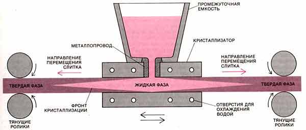 Один из путей снижения технологических отходов - применение способа непрерывного литья, или разливки стали. Этот способ состоит в том, что жидкая сталь непосредственно из ковша или через промежуточное разливочное устройство непрерывно заливается в водоохлаждаемую форму, называемую кристаллизатором. Перед началом разливки в кристаллизатор вводится специальное устройство с замковым захватом ("затравка") как дно для первых порций металла. После затвердевания металла у стенок кристаллизатора затравка при помощи тянущих механизмов вытягивается из кристаллизатора, увлекая за собой формирующийся слиток. Поступление жидкого металла продолжается и слиток непрерывно наращивается.