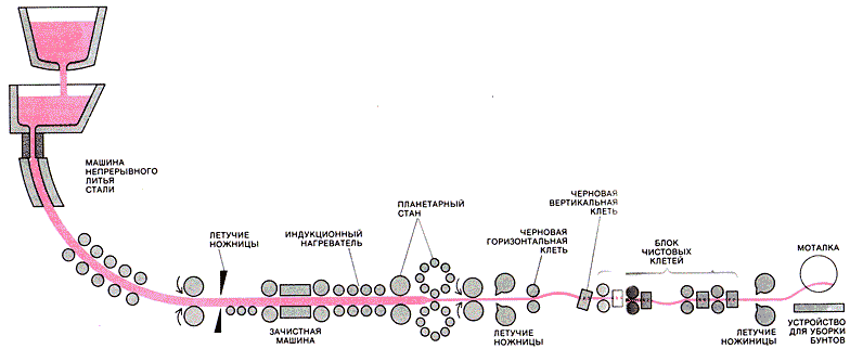 Схема литейно-прокатного агрегата для производства из разных легированных сталей проволоки диаметром от 8 до 12 мм. В агрегате используется одноручьевая непрерывно-литейная машина радиального типа, позволяющая получать слиток сечением 80 х 60 мм. Из литейной машины слиток поступает в зачистную машину, в которой производится очистка его поверхности. Перед зачистной машиной установлены летучие ножницы для обрезания переднего конца слитка в начале процесса, либо самого слитка в случае нарушения процесса прокатки. После зачистки поверхности слиток подается в индукционный подогреватель, а затем в планетарный стан с двусторонним обжатием, где происходит его деформация до квадратного (20х20 мм) сечения. На выходе из планетарного стана передний конец слитка обрезается летучими ножницами барабанного типа, а слиток далее поступает в непрерывный прокатный стан, состоящий из черновых и чистовых клетей, в котором производится его прокатка в проволоку требуемого сечения. За прокатным станом установлены летучие ножницы барабанного типа, разрезающие проволоку при нарушении процесса ее сматывания. В сматывающих устройствах проволока сматывается в бунты, а затем поступает на склад. Скорость выхода проволоки до 15 м/сек.Качество непрерывно-литого ме-1\талла выше по сравнению с металлом, отлитым в изложницы. Однако оно уступает качеству металла, подвергнутого последующей обработке давлением, т.е. прокатке. В связи с этим возникла идея объединить процессы непрерывного литья и прокатки в одном агрегате. Разработка и применение технологии получения проката непрерывным методом из жидкого металла открывают огромные перспективы в повышении эффективности металлургического производства. Во-первых, появляется возможность более полно использовать первичную теплоту слитка для его последующей деформации. Во-вторых, отпадает необходимость выполнения всех промежуточных операций между металлоплавильным и прокатным цехами; становятся ненужными транспортные операции и склад слитков. В-третьих, исходный слиток, поступающий в валки стана, практически приобретает непрерывность, или бесконечность. Это преимущество имеет особое значение в связи с тем, что при прокатке бесконечного слитка может быть использован эффект беспрерывного натяжения, благодаря которому принципиально изменяется сущность самого процесса пластической деформации. Если в процессе продольной прокатки прикладывать значительные растягивающие усилия по оси прокатываемого тела, т.е. в направлении движения, то характер пластической деформации тела существенно изменяется. Благодаря эффекту беспрерывного натяжения стремление прокатываемого изделия деформироваться в поперечном направлении уменьшается при одновременном снижении усилий на валки прокатного стана.Беспрерывный, безостановочный процесс прокатки дает возможность создавать натяжение, более высокое, чем при обычной прокатке, - близкое по величине к половине сопротивления пластической деформации прокатываемого изделия. Уширение его тогда будет не только отсутствовать, но может стать отрицательным, т.е. ширина изделия будет уменьшаться. Иными словами, применение беспрерывного процесса прокатки с использованием эффекта беспрерывного натяжения открывает возможность полностью устранить излишнее уширение пр