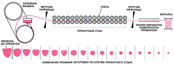 При применении непрерывного литейно-прокатного агрегата процесс от жидкой стали до готового бунта занимает 10-15 минут, обычный же процесс требует выполнения следующих 6 операций: отливка слитков в изложницы; их обдирка; нагрев и ковка; второй нагрев и прокатка; чистка поверхности; третий нагрев и прокатка проволоки. Все операции связаны с отходами металла и занимают в общей сложности около 75 часов. Опыт эксплуатации этого агрегата в течение нескольких лет свидетельствует о явных преимуществах освоения процесса получения проката непосредственно из жидкой стали.