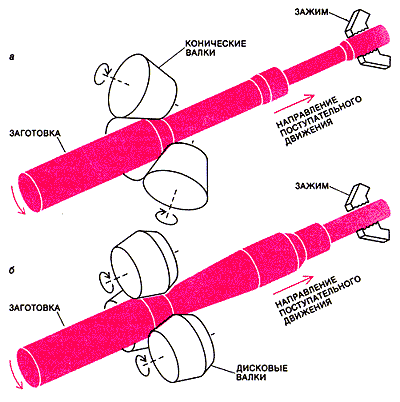 Винтовая прокатка с меняющимся положением осей валков применяется для производства валов и осей переменного диаметра и большой длины (в среднем в 10-20 раз превышающей диаметр). Прокатка производится в горячем состоянии тремя валками конической (а) или дисковой (б) формы на ограниченном участке по длине изделия. Конец заготовки толкателем подается между валками, и он захватывается автоматическими зажимами. Валки сближаются, заготовка начинает вращаться, одновременно перемещаясь вместе с зажимом в осевом направлении. Изменение диаметра изделия во время прокатки осуществляется раздвижением или сближением валков с помощью управляемой гидравлической системы. Форма валков определяется требуемой формой вала или оси. На этом принципе основана конструкция многих действующих в СССР прокатных станов, в частности станов для прокатки заготовок осей для железнодорожных вагонов.Для снижения отходов металла и трудоемкости при производстве указанных деталей ВНИИметмаш разработал оригинальный процесс винтовой прокатки. Он также основан на непрерывном движении пояса деформации вдоль вращающегося изделия. Главная его особенность состоит в том, что обжатие исходного круглого прутка - по ходу его поступательного движения - изменяется сближением или раздвижением валков по заданной программе. Благодаря этой особенности характер формоизменения прокатываемого изделия не зависит от калибровки валков и определяется программой. Поэтому при прокатке переход к обработке каждой последующей заготовки не требует смены валков. Проведенные ВНИИметмашем исследования закономерностей этого нового непрерывного процесса пластического формоизменения дали возможность создать (под руководством сотрудников института Е.И.Левина, Е.А.Стоши и С. П. Милютина) несколько оригинальных станов для осуществления этого процесса на производстве.Первыми станами, работающими по этому принципу, были станы для прокатки шпинделей текстильных веретен диаметром до 12 мм, задних полуосей диаметром около 50 мм для автомобилей, полуосей и валов диаметром до 120 мм для тракторов и электродвигателей и несколько других станов. Каждый из них обеспечивает экономию металла на 20-35% по сравнению со старой технологией.