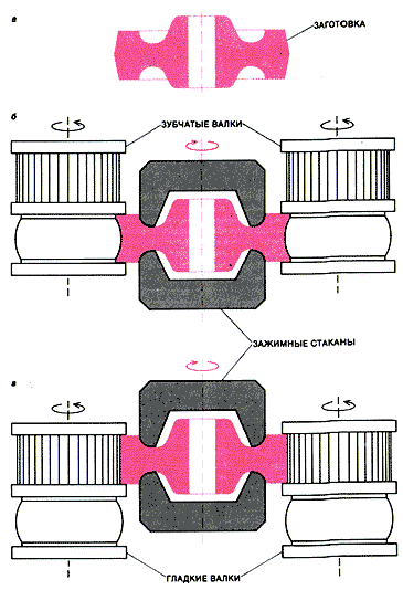Прокатка зубьев зубчатых колес непосредственно на штампованной заготовке осуществляется в два этапа. Сначала заготовка, зажатая в зажимных стаканах, помещается между двумя вращающимися гладкими валками (а). Ей сообщается принудительное вращение с определенной скоростью, после чего валки сближаются и производится обкатка заготовки с целью придания ее ободу вогнутого профиля для более точного последующего образования зубьев. После обкатки валки раздвигаются и заготовка перемещается во вторую позицию - между вращающимися зубчатыми валками (б). Валки сближаются, и их зубчатые выступы углубляются во вращающуюся заготовку, образуя на ней зубья. Этот процесс заменяет две операции механической обработки: обточку заготовки по торцу и предварительное зубофрезерование. Одно из основных преимуществ замены операций механической обработки состоит в повышении прочности зубьев на изгиб и износостойкости на 20 -35% благодаря упрочению металла в результате пластического деформирования.Впоследствии был разработан способ прокатки зубьев крупномодульных зубчатых колес непосредственно из штампованной заготовки. При этом способе прокатка осуществляется (также с высокочастотным нагревом заготовки) в две операции: обкатка заготовки в гладких валках с целью получения необходимых размеров по диаметру и ширине кольца; прокатка обкатанной заготовки в зубчатых валках для получения зубьев. Этот процесс заменяет две операции механической обработки: обточку заготовки по наружному диаметру и торцам и предварительное (черновое) зубофрезерование.
