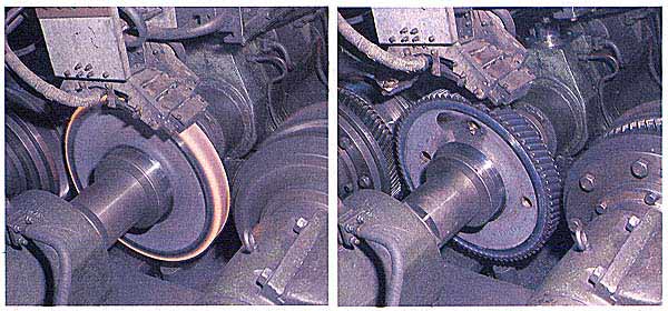 При прокатке зубьев зубчатых колес используется высокочастотный нагрев заготовки. На снимках показан узел зубопрокатного стана, установленного на одном из московских заводов. Обод вращающегося колеса диаметром около 1 м нагревается (левый снимок) с помощью расположенного над ним индуктора до температуры примерно 1100°С, затем происходит обработка заготовки сначала в гладких, а затем в зубчатых валках. После окончания прокатки (правый снимок) зубчатые валки отходят от готового колеса заготовки. Производительность стана 5-10 колес в час.Первые типовые зубопрокатные станы созданы ВНИИметмашем (под руководством сотрудников института А.Д.Кузьмина, М.В.Васильчикова, М. В. Барбарича и В. Ф. Муконина), а их серийное производство было организовано Электростальским заводом тяжелого машиностроения. Эти станы полностью автоматизированы и механизированы. Благодаря указанным преимуществам нового метода формообразования зубьев зубчатых колес созданные для выполнения этого процесса станы с каждым годом находят все более широкое применение. Последние исследования показывают, что точность прокатки зубьев может быть повышена и чистовое фрезерование исключено.Во многих машинах, и особенно сельскохозяйственных, широко применяются цепные передачи, в которых одним из главных элементов являются зубчатые колеса, называемые цепными колесами или звездочками. Ввиду большой их потребности полученный опыт прокатки зубчатых колес был перенесен ВНИИметмашем в технологию также цепных колес. Созданные для этой цели станы дали еще более значительный эффект, чем станы для прокатки зубчатых колес непосредственного зацепления. Во-первых, для цепных колес удалось достигнуть более высокой точности профиля зубьев и благодаря этому полностью исключить операцию фрезерования. Во-вторых, в связи с наклепом и использованием явления уширения существенно повысилась прочность зубьев и одновременно уменьшилась толщина исходной заготовки. Например, при толщине диска 8 мм ширина зуба колеса становится равной 11 мм. В результате масса цепного колеса снизилась на 20-З0%, а производительность труда возросла в 5-7 раз.