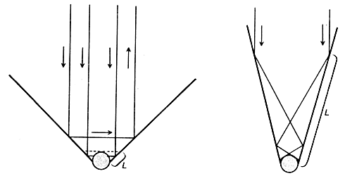 Экспозиция с отражением: солнечные лучи отражаются от верхней поверхности крыльев, попадают на тело бабочки и поглощаются. Крылья располагаются над телом буквой V. Угол между крыльями может изменяться в широких пределах. У некоторых видов он велик (слева). В этом случае только те лучи, которые падают на небольшой участок поверхности крыла у самого его основания (L), отражаются на тело бабочки. У других видов крылья образуют более узкий угол (справа) и площадь, с которой лучи попадают на тело, больше. Если угол очень мал, то на тело попадают даже лучи, отраженные вершиной крыла.Чтобы эффективно отражать солнечные лучи крылья должны быть белыми или серебристыми. И действительно, основная группа бабочек, согревающихся на солнце с помощью отражения лучей света от поверхности крыльев, даже называется белянками из-за окраски верхней поверхности крыльев (к белянкам, например, относится род Pieris.) Бабочки этой группы обычно держат крылья под углом к телу, наподобие буквы V. Величина угла между крыльями существенно влияет на эффективность попадания на тело солнечных лучей, отраженных от крыльев.Солнечные лучи, падающие на внутреннюю поверхность раздвинутых буквой V крыльев, отражаются и часть их попадает на тело бабочки, а часть уходит в сторону, не коснувшись тела. Тела достигают лишь те лучи, которые падают на ближайшую к нему часть крыла. Площадь этого участка определяется углом между крыльями. Если угол велик, только лучи, отраженные от небольшого участка у самого основания крыла, коснутся поверхности тела. Если угол маленький, на тело попадают лучи, отраженные от большего участка поверхности крыльев, иногда включая даже и вершину крыла. У каждого вида рода Pieris есть своя характерная поза для согревания под солнечными лучами, и этой позе соответствует окраска крыльев: существует некоторая связь между оттенком вершины крыла и той ролью, которую она играет в регуляции температуры тела.