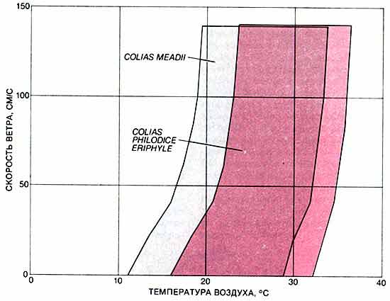 Стремясь использовать преимущества инженерного подхода, Р. Моффет из Станфордского университета и я построили математические модели, отражающие связи между физическими свойствами, влияющими на терморегуляцию (например, окраской крыльев) и погодными условиями, при которых данный вид может летать. Эти связи могут быть изображены в графической форме, предложенной У. Портером из Висконсинского университета в Мадисоне и Д. Гейтсом из Мичиганского университета, в виде "летного пространства" - области в системе координат температура воздуха-скорость ветра, охватывающей все условия, при которых бабочка данного вида может набрать достаточное для взлета количество тепловой энергии.