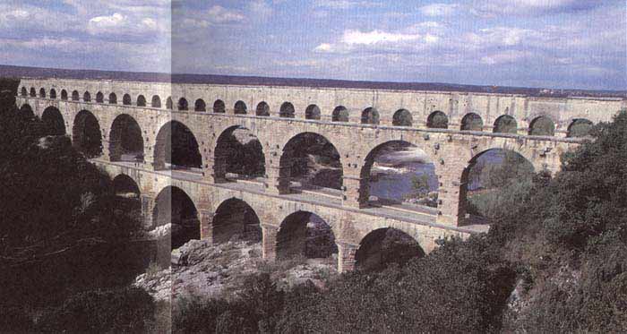 В любой из погожих солнечных дней близ города Нима, что на юге Франции, можно встретить тысячи экскурсантов, гуляющих по мосту через реку Гардон, или Гар, который был построен 240 лет назад. Большинство из них почти не обращают внимания на искрящуюся под лучами солнца реку, утопающую в буйной растительности речную долину или расположенное у них под ногами старое сооружение. Их взоры прикованы к еще более великолепному зрелищу - знаменитому Пон-дю-Гару. Так называется каменный мост высотой с 16-этажный дом (48,77 м), три арочных яруса которого были сооружены около 2 тыс. лет назад римлянами.