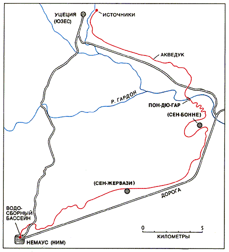 По акведуку, тщательно исследованному нами в 1985 г., когда-то самотеком поступала вода. Ее путь начинался от источников вблизи небольшого селения Уцеция (ныне Юзес) и заканчивался у склона холма в Немаусе, где находился круглый "кастеллум" (водосборный бассейн). Оттуда вода по десяти распределительным трубопроводам подавалась на более низкие уровни.