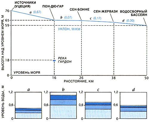 Кривая изменения высоты расположения трассы канала над уровнем моря. Канал имел очень малый уклон (в среднем 0,34 м/км). Эта величина получается делением 17-метрового перепада высоты (между Уцецией и Немаусом) на 50 км. Несмотря на небольшой уклон, глубина воды в различных участках канала была часто оптимальной и равнялась примерно 0,6 м. Внизу приведены значения глубины основных участков канала для периодов с разными расходами воды из источников: малым (светпо-синий), средним (синий) и большим (темно-синий). Следует обратить внимание, что глубина была оптимальной в самой пологой части канала (непосредственно за мостом) при минимальном расходе воды и в конечной его части (между Сен-Жервази и Немаусом) при максимальном расходе.Удалось ли строителям добиться того, чтобы вода свободно текла по критически важному нижнему участку канала? По нашим расчетам глубины воды на данном участке, эта задача была решена весьма успешно. Мы выяснили, что с учетом ряда условий глубина здесь была близка к оптимальному значению 0,6 м. При прохождении по каналу наименьшего количества воды ее глубина в самой пологой части канала, сразу после Пон-дю-Гара, была идеальной. То же самое наблюдалось при максимальном потоке в наиболее крутой (конечной) секции непосредственно перед водосборным бассейном. С помощью эмпирически полученного выражения, известного как формула Маннинга, мы получили расчетное значение уровня воды. Оно также оказалось равным 0,6 м для среднего уклона 0,187 м/км по всему участку канала ниже моста в периоды умеренного потока.Мы также проанализировали, насколько вероятной была опасность переполнения канала, т.е. повышения уровня воды за отметку 1,2 м, что привело бы к ее утечке или уменьшению пространства над водой, необходимого для нормальной работы людей, обслуживавших канал. Мы пришли к выводу, что такая опасность отсутствовала. В самом пологом месте канала, т.е. там, где скорость воды должна снижаться, а уровень быть максимальным, "квадратная часть" была достаточно емкой для того, чтобы вместить воду, вытекавшую из источников в период наибольшего уровня воды в них. Трудно представить, чтобы столь экономично построенный и эксплуатируемый канал мог быть более совершенным по своей конструкции.