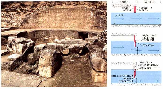 Водосборный бассейн (слева), вероятно, имел два расположенных друг за другом затвора, с помощью которых можно было регулировать поступление воды из канала в бассейн. Затворы служили также для измерения (справа) расхода воды в канале, величина которого определялась по разнице уровней воды в бассейне и канале, а также с учетом размера подводного отверстия переменного сечения, через которое вода поступала в бассейн. Перед измерением расхода затворы находились в поднятом положении (справа вверху), соответствующем полному расходу. Смотритель опускал передний затвор до совмещения отметки на нем с уровнем воды в бассейне (справа в центре). Потом он постепенно опускал задний затвор, пока тонкая струйка воды не начинала перетекать из канала через передний затвор в бассейн. Это указывало на достижение заданного перепада уровней (справа внизу). Расход определялся по водомерной рейке, прикрепленной к заднему затвору, или же умножением размера подводного отверстия на заданный постоянный коэффициент.Шлюз-регулятор состоял из двух расположенных друг за другом затворов, которые перекрывали канал по ширине, а по высоте немного не доходили до его половины. Как нам представляется, шлюз-регулятор использовали следующим образом. По ночам измерения, видимо, не проводились, поэтому оба затвора в это время суток были подняты, а уровни воды в бассейне и канале были одинаковыми. Утром кастеляриус, или смотритель, с помощью веревок, пропущенных через отверстия вверху каменных плит, опускал передний затвор до совмещения отметки на нем с поверхностью воды в бассейне. При этом верхняя кромка затвора оказывалась на определенной высоте (уровне заданного напора) над поверхностью воды в бассейне. Затем смотритель опускал задний затвор, тем самым уменьшая размер подводного отверстия и заставляя воду подниматься в канале.Смотритель продолжал медленно опускать задний затвор до тех пор, пока тонкая струйка воды не начинала перетекать в бассейн через передний затвор, что указывало на достижение водой в канале уровня верхней кромки этого затвора и тем самым заданного напора. В этот момент смотритель отмечал высоту отверстия по водомерной рейке на заднем затворе, а затем, для определения расхода воды, умножал ее показания на постоянный коэффициент. Рейка, возможно, была отградуирована на прямые показания расхода.