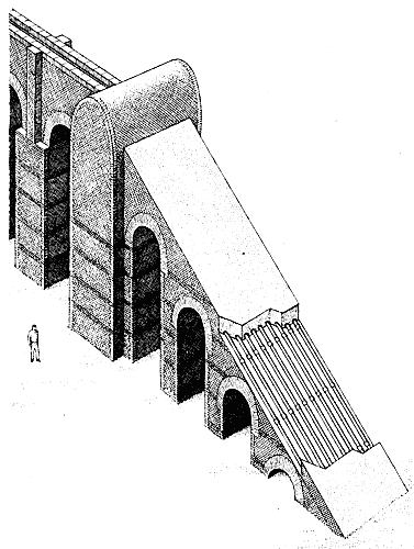 После второго геникулуса трубы поднимались по противоположному склону ущелья. Наверху вода поступала в приемный резервуар, аналогичный напорному, а из него - в обычный водопровод. Приемный резервуар устанавливался заметно ниже уровня напорного резервуара; разность их уровней составляла так называемый гидравлический градиент. Вода могла бы подняться до своего первоначального уровня, если бы ее движение не замедлялось постепенно возрастающим трением в девяти тонких трубах. В трубах площадь соприкосновения воды со стенками значительно больше, чем в обычном прямоугольном канале, в частности, потому, что такой канал не заполнялся полностью и вода в его верхней части текла без трения о стенку. Следовательно, если бы оба конца сифона были на одном уровне, движение воды через сифон было бы настолько медленным, что произошло бы переполнение напорного резервуара. Для того чтобы обеспечить подачу воды в нужном объеме и с нужной скоростью, при устройстве сифона через ущелье приходилось мириться с большей потерей высоты, чем при сооружении обычного моста-акведука. Гидравлический градиент сифона был примерно в 10 раз больше нормального уклона моста-акведука.