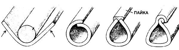 Сифонные трубы изготавливали гибкой свинцового листа на деревянном сердечнике. Сердечник затем вынимали, а верхний шов зачеканивали молотками или запаивали, чтобы обеспечить гидравлическую плотность {три правых рисунка). Трубы имели овальное или грушевидное поперечное сечение.Подсоединенные к напорному резервуару, трубы опускались по короткому откосу до земли и проходили по склону ущелья с заглублением примерно на 1 м. Подземная прокладка труб, использованная, по-видимому, для их защиты от повреждения человеком, предотвращала также чрезмерное расширение труб в жаркие дни.