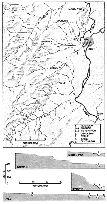 Лионская система имела четыре водопровода: Монт-д'Ор, Бревенн, Грапонн и Жье. Всего в ней было 9 сифонов, что определялось числом глубоких ущелий, через которые проходили водопроводы. На нижнем рисунке показаны профили водопроводов Лионской системы. Названия сифонов пронумерованы (см. в нижнем правом углу карты) и те же цифры нанесены на карту, чтобы показать их положение на местности. Система подавала 80 000 м3 воды в сутки.В дополнение к тому факту, что вода поднимается в сифоне до своего первоначального уровня, древне-римские строители должны были учитывать действие в сифоне трех сил. Во-первых, это трение в трубах, которое замедляло течение воды настолько, что приходилось жертвовать высотой для того, чтобы обеспечить постоянный ток воды. Во-вторых, статическое давление в трубе, зависящее от глубины ее закладки относительно исходного уровня воды. Статическое давление создается самим присутствием воды и действует одинаково во всех направлениях. Оно остается неизменным независимо от того, движется вода или нет. В-третьих, инерционный напор, создаваемый водой в перегибах трубопроводов при ее движении. Инерционный напор направлен вовне по отношению к изгибу. Вторая сила действует всегда, когда сифон наполнен водой. Все три силы находятся в действии, только когда сифон наполнен и пропускает воду.
