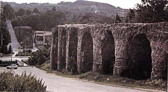 Напорный резервуар и откос - элементы сифона в Сусьё на водопроводе Жье, одном из четырех водопроводов, снабжавших водой древнеримский Лугдунум (ныне Лион). Вода поступала из открытого канала в резервуар, а из него - в девять узких свинцовых труб. Трубы спускались по откосу (на переднем плане), шли вниз по склону ущелья с заглублением примерно на 1 м, пересекали низкий мост (вентер) и поднимались по противоположному склону к приемному резервуару. Оттуда вода стекала в открытый канал.Водопровод Крапонн служит свидетельством когда-то существовавшего воистину огромного сифона длиной около 6 км, который опускался почти на 100 м ниже гидравлического градиента. Остатков этого сифона почти не сохранилось, и свидетельство о нем является в большей мере чисто топографическим: известно, что водопровод пересекал широкое и глубокое ущелье, слишком большое для сооружения моста, и, следовательно, там был использован сифон.Даже по древнеримским нормам количество воды, поступавшей по четырем лионским акведукам, не было особенно внушительным. По оценкам оно составляло 80 000 м3 в сутки, т.е. значительно меньше, чем у древнеримской водопроводной системы, - от 700 000 м3 до 1 млн. м3 в сутки. (Все цифры водопотребления в Древнем Риме могут показаться необычно высокими современному читателю, но нужно иметь в виду, что римляне почти не пользовались кранами и вода текла непрерывно, обеспечивая промывку канализационных стоков).
