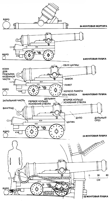 Пушки и мортиры военных кораблей XVIII в. На нижней палубе корабля "Сантисима Тринидад" были установлены тридцать 32-фунтовых орудий (называемых так по массе ядра, которым они стрелял и). В конце XVI II в. 32-фунтовые орудия были самыми большими на флоте. Они имели длину ствола более 3 м и могли поражать цепь на расстоянии 1,5 мили. На средней палубе корабля "Сантисима Тринидад" находились два 18-фунтовых и двадцать шесть 8-фунтовых орудий и мортир. Когда добавили четвертую орудийную палубу, число пушек увеличилось со 120 до 144. Снасти для установки орудий после откатывания показаны для 32-фунтовой пушки.Для того чтобы уменьшить бортовую качку, корпус испанского навио строился таким образом, что ширина нижней палубы была больше, чем ширина средней и верхней палуб. Естественно, нижняя палуба была более устойчивой, и на ней устанавливалась самая большая пушка (длиной 3 м), стрелявшая 32-фунтовыми ядрами. На корабле "Сантисима Тринидад" было 30 таких пушек, по 15 с каждого борта. С близкого расстояния ядро пушки могло пробить борт из дуба толщиной около 1 м. Два или три ядра могли нанести вражескому судну серьезные повреждения. 32-фунтовое ядро способно было поразить цель на расстоянии до 1,5 мили.На средней и верхней палубах кроме пушек находилась большая часть жилых помещений для команды. Койки подвешивались между орудиями и перед боем складывались и убирались. В средней части корабля размещался камбуз, на единственный зачастую плите которого матросы готовили пищу и кипятили воду. Команда испанского навио была чересчур многочисленной и состояла как из профессиональных моряков, так и из людей, не имеющих опыта мореплавания. Команда корабля "Сантисима Тринидад" во время участия в Трафальгарском сражении состояла из 1200 матросов и солдат морской пехоты, многие из которых еще только выздоравливали после эпидемий малярии и холеры, свирепствовавших на юге Испании в 1802-1804 гг. Для сравнения: команда английского корабля 1-го ранга "Виктори" состояла всего из 900 профессиональных моряков.