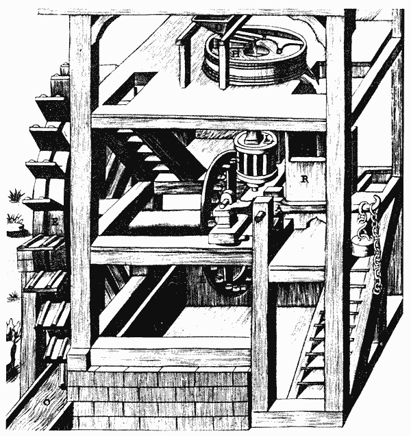 В древности инженеры использовали вращательное движение водяного колеса только в двух целях - для помола зерна и в качестве черпаковых подъемников воды (норий). В последних какие-либо передаточные механизмы не применялись. В мукомольных же мельницах использовалась ортогональная передача. Шестерни, установленные на одном конце оси колеса, изменяли скорость вращения и позволяли передать вращательное движение из вертикальной плоскости в горизонтальную и тем самым сообщать вращение жерновам. Дальше этого инженерная мысль в ту эпоху не продвинулась, хотя в одной из поэм римского поэта Аусониуса, жившего в IV в., и говорится о пиле, работающей, по-видимому, от водяного колеса.
