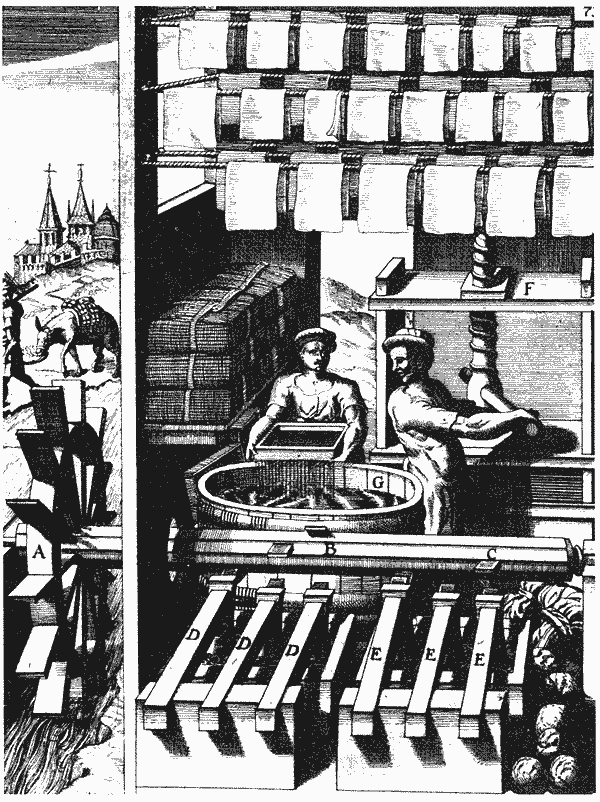 Мельницы с катящимся жерновом отличались от мукомольных тем, что верхний камень катился по нижнему, а не вращался на нем, соприкасаясь всей плоскостью. Изобретенные в XI-XII вв. такие мельницы использовались для переработки маслин и получения из них масла или для переработки сахарного тростника. Рисунок заимствован из книги 1607 г. Витторио Зонка "Novo teatro di machine".Применение водяных молотов постепенно расширялось. С тех пор как в Азии была изобретена бумага, ее исходный продукт - целлюлозу - получали вручную путем измельчения в воде пенькового или льняного тряпья. Технология изготовления бумаги в Западной Европе счала известна лишь в начале XII столетия. В конце XIII в. европейские производители бумаги значительно усовершенствовали технологию бумажного производства, механизировав операции получения целлюлозы с помощью рычажных молотов, которые не были известны ни китайцам, ни арабам. К началу XVII столетия таких бумагоделательных станков с приводом от водяного колеса только в Англии насчитывалось 38. В 1710 г. их было уже 200, а в 1763 г. - 350.