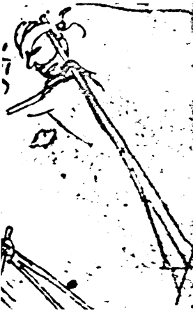 Еще одним вариантом орнитоптера, предложенным Леонардо в те же годы, был аппарат, в котором человек должен был осуществлять взмахи крыльями, наподобие велосипедиста вращая ногами колеса, соединенные рычагами с силовой конструкцией крыльев (рис. 3). На наброске этого аппарата обращает на себя внимание нечто напоминающее колокольчик, подвешенный перед лицом "пилота". Исследователи до сих спорят, что бы это могло быть. На мой взгляд, данное устройство - это маятник, предназначенный для индикации положения в пространстве. Известно, что примерно в 1485 г. ученый сделал эскиз такого устройства (рис. 4). Если это так, то мы видим первый рисунок авиационного прибора.