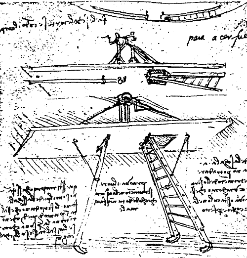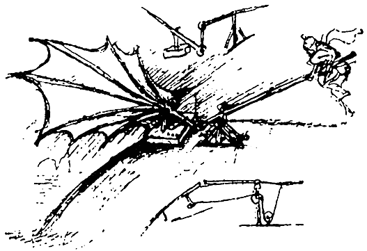 Леонардо так объяснял концепцию своего нового орнитоптера: "Я решил, что стоять на ногах лучше, чем лежать плашмя, ибо прибор никогда не может перевернуться вверх ногами... Подъем и опускание при движении [крыльев] будут производиться опусканием и подниманием обеих ног, что дает большую силу, а руки остаются свободными. Если бы тебе пришлось бы лежать плашмя, то ноги, в берцовых суставах, сильно уставали бы..." *.