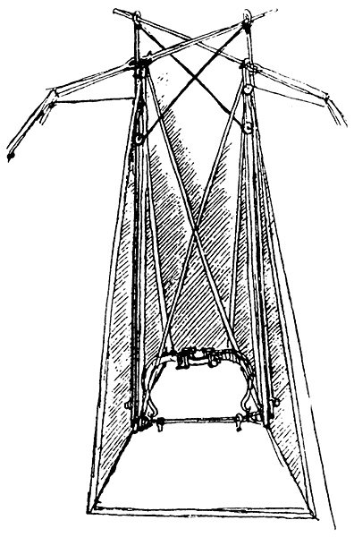 * Леонардо да Винчи. Избранные естественно-научные произведения. М, 1955. С. 605.Для управления высотой полета да Винчи предложил оригинальный механизм, состоящий из подвижного горизонтального хвостового оперения, соединенного с обручем на голове человека. Поднимая и опуская голову, испытатель должен был, по замыслу Леонардо, поднимать и опускать хвостовую поверхность орнитоптера (рис. 2).