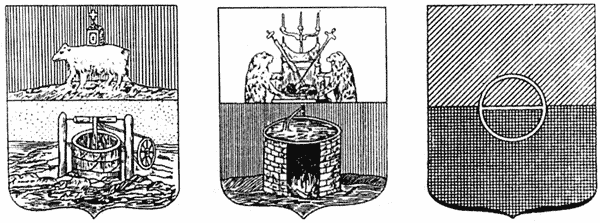 Рис. 1. Герб уездного г. Соликамска Пермской губернии утвержден в июле 1783 г. "В верхней части герб Пермской губернии, в нижней - соляной колодезь, с опущенным в него ведром, для вы-нутия соли и с означенным на оном соляными потоками".Выварка соли приносила огромные прибыли и государству, и монастырям. Русские цари благоволили монастырям и предоставляли им льготы - не брали с них пошлин за соль. В грамоте, данной в 1473-1478 гг. "митрополиту-соловару" Роденского монастыря, было сказано, что "не надобе с тех варниц и с тех дворов [...] ни в какие пошлины ни в розметы, ни иные им никоторые пошлины ненадобе" [10]. Особыми милостями и вниманием царей пользовался Соловецкий монастырь. В 1551 г. еще Иван Грозный выдал монастырю "несудимую грамоту" о невзятии пошлины с соли [11]. Ненакотские, Соловецкие и Сийские соляные промыслы принадлежали Кирилло-Белозерскому монастырю, которому в 1615 г. разрешили беспошлинную торговлю солью. Грамоты о беспошлинной продаже соли выдавались монастырям, причт которых молился о государях, о долговечной их жизни. Также грамоты имели Карельский, Кирилловский, Сийский, Печенгский, Кандалакшский, Муромский, Николаевский, Прилуцкий, Симонов и Карельский монастыри (грамота, 1623 г.) вырабатывали 4 тыс. пудов (около 65 т) соли в год без пошлины, а сверх выработанного количества соли пошлина взималась на общих основаниях. Подобная грамота на беспошлинную продажу 7 тыс. пудов (113 т) в год соли была дана и Архангельскому монастырю [12].Рис. 2. Герб уездного г. Старая Русса Новгородской губернии утвержден 16 августа 1781 г. "В верхней части щита герб Новгородский; в нижней, в красном поле, железная сковорода, на которой варится соль, поставленная на кирпичной разженной печке, понеже в сем городе имеются знатные соляные варницы".>