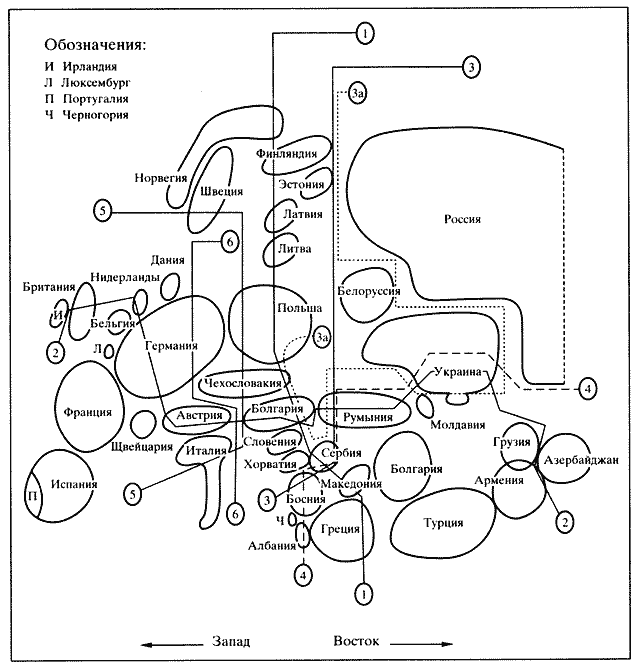 Линии раздела Восток-Запад на территории Европы [12]Этические нормы протестантизма первоначально были выработаны как противопоставление традиционализму. Парадокс состоит в том, что протестантизм ныне стал традицией и необсуждаемой нормой поведения. Может ли гражданин России принять моральные ценности протестантизма? Что может быть идейным стержнем для жителей России? Пока только сознание того, что они русские. Именно это должно помочь в воспитании чувства собственного достоинства, вопреки сознательному и яростному унижению, которое следует воспринимать как пули противника.1-1 - географическая граница от мыса Нордкап до мыса Матапан; 2-2 - римский лимес, очень близкий к границе возделывания винограда (виноделие) и границе между католицизмом и протестантизмом: 3-3 - граница между католиками и православными; За-За - греческие католики (униаты); 4-4 - оттоманская линия, близкая к современной границе распространения ислама: 5-5 - индустриализация XIX столетия; 6-6 - железный занавес 1955-1989 гг.Границы между Западной Европой и Россией проводятся по религиозному признаку противопоставления православия католическому и протестантскому мирам. Выделяются следующие области цивилизаций: исламская (примерно в границах бывшей Османской империи), христианская западноевропейская, отчетливо разделяющаяся (примерно по границе бывшей Римской империи и географической границе возделывания винограда) на католическую и протестантскую.