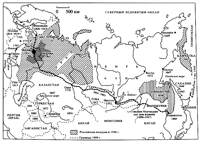 Территориальный рост Соединенных Штатов Америки (по П. Крокатту [16]) Западные территории взяты у Британии в войне за независимость в 1783 г.; Луизиана куплена у Наполеона в 1803 г.; Флорида завоевана у Испании в 1819 г.; Республика Техас аннексирована в 1845 г.; Орегон получен от Британии в 1846 г.; западное побережье занято в войнах с Мексикой к 1848 г.; на карте не поместилась Аляска, купленная у России в 1867 г. После достижения "пределов роста", определяемых возможностью интеграции и действенности центральной власти, империя переходит в консервативное состояние, направленное на удержание своих частей, их слияние, подавление внутренних центробежных тенденций. Она стремится перейти в состояние консервативного устойчивого развития. Размерами империи до известной степени ограничивается возможность ее разрушения извне без активизации дезинтеграционных процессов. Тем не менее внешняя угроза остается основной цементирующей силой. Консервативные тенденции в империи обусловливают необходимость эффективного чиновничьего аппарата, коррумпированность которого подавляется страхом жестоких репрессий со стороны центральной власти, периодически их осуществляющей. Безнаказанность аппарата противопоказана для имперской организации, нуждающейся в военной субординации. Расплатой за устойчивость оказывается замедление развития на время, необходимое для принятия решения центральной властью. Структуры, основанные на государственной собственности, характерны для "азиатского способа производства", отличного от капиталистического, и свойственны большинству государств неевропейского типа [15].Территориальный рост России до 1917 г. (по П. Крокатту [16]) Даты указывают год присоединения территории или возникновения поселения. Присоединение Сибири происходило путем заселения столетием раньше американской войны за независимость, Новороссии в Причерноморье - одновременно с ней. Мусульманский Туркестан был присоединен лишь в конце 1880-х годовСлово "национализм", как и слово "империя", обозначает что-то нехорошее. В Советском Союзе "национализм" был предан проклятью, потому что противоречил политике классового интернационализма, был связан с "русским шовинизмом" и мелкобуржуазной идеологией, служил синонимом расизма, воплощенного в фашизме и нацизме. Вместе с тем признавалось право наций на самоопределение и поддерживалась противоречивая политика культуры "национальной по форме, социалистической по содержанию". На этих понятиях строилась социальная психология советского человека с постоянным упоминанием "равноправия наций" в этническом понимании.