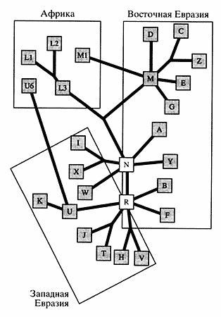 Первым приложением ДНК-маркеров к проблеме происхождения и расселения человечества стали выполненные Канном с коллегами исследования митохондриальной ДНК представителей различных рас - африканцев, европейцев, азиатов, австралийцев и жителей Новой Гвинеи. По количеству замен нуклеотидов в мтДНК была определена степень родства различных групп людей и построено эволюционное древо человечества (рис. 1). Самая ранняя точка ветвления на древе отделяет от остальных людей группу африканцев, что указывает на африканское происхождение Homo sapiens. Именно в Южной Африке найдены самые древние мутации у бушменов и готтентотов и зарегистрировано самое высокое разнообразие мтДНК.