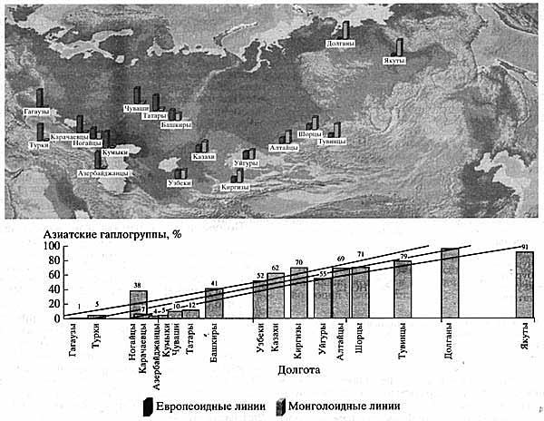 Сравнительный анализ типов мтДНК в 18 популяциях Евразии, включая популяции Волго-Уральского региона (гагаузов, турков, татар, башкир, чувашей, карачаевцев, кумыков, азербайджанцев, узбеков, казахов, киргизов, ногайцев, уйгуров, шорцев, тувинцев, долган, якутов), которые относятся к тюркской ветви Алтайской языковой семьи, позволил установить западно-восточный градиент увеличения частоты азиатских линий мтДНК на расстоянии 8000 км: от 1% у гагаузов из Молдавии до 95% у якутов и 99% у долган (рис. 4). Кроме того, установлено, что лингвистическое сходство популяций играет меньшую роль, чем географическая близость или отдаленность популяций.
