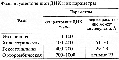 Обобщив результаты, полученные многими исследователями, выделим основные фазы, наблюдаемые при концентрировании двухцепочечных молекул ДНК (таблица). При некоторой, так называемой критической, концентрации молекулы ДНК спонтанно конденсируются, формируя фазу с характерным расстоянием между молекулами от 51 до 30 А. Две особенности присущи этой фазе. Как следует из рентгенограмм, молекулы ДНК в образующейся фазе упорядочены, однако трехмерный порядок в их расположении отсутствует, то есть для фазы характерны свойства одномерного кристалла. В то же время фаза обладает текучестью, и соседние молекулы ДНК сохраняют присущие им некоторые диффузионные степени свободы, то есть для фазы характерны свойства жидкости. Именно сочетание этих двух разных особенностей позволяет использовать термин лиотропная "жидкокристаллическая" для обозначения фазы, возникающей в результате концентрирования ДНК.