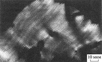 Изображение в поляризованном свете (данные С.Г. Скуридина)Молекулы ДНК в образующейся фазе упаковываются таким способом, что в ее структуре можно выделить "слои" из соседних молекул, причем вследствие присущей молекулам ДНК анизотропии (геометрической и оптической) соседние слои повернуты относительно друг друга на небольшой угол. В результате для возникающей жидкокристаллической фазы характерна спиральная закрутка пространственной структуры; такая фаза носит название "холестерической" *. Именно в силу спиральной закрутки слоев холестерическая фаза обладает текстурой "отпечатков пальцев" (рис. 2).