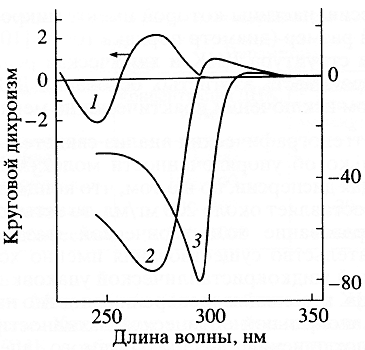 Рис. 3. Спектры кругового дихроизма линейной В-формы ДНК (1), жидкокристаллической дисперсии ДНК (2) и жидкого кристалла ДНК (3)Частицы холестерической дисперсии существуют только в определенном интервале осмотического давления растворителя, задаваемого, например, концентрацией полиэтиленгликоля в растворе. Выход за нижний предел приводит к изотропному состоянию, выход за верхний предел - к гексагональной упаковке молекул ДНК в частицах дисперсии. В ходе обоих процессов исчезает аномальная оптическая активность, что свидетельствует о весьма подвижной пространственной организации холестерика ДНК. Поскольку холестерические жидкокристаллические дисперсии ДНК формируются в водно-полимерных растворах, имеющих определенное осмотическое давление и диэлектрическую постоянную, направление закрутки пространственной холесте-рической спирали зависит от свойств растворителя [10].Взаимодействие биологически активных соединений с молекулами ДНК, входящими в состав частиц холестерической дисперсии, может менять свойства ДНК. Это, в свою очередь, означает, что при определенной структуре биологически активных молекул, взаимодействующих с ДНК, формирование дисперсий из комплексов "ДНК-биологически активное соединение" может сопровождаться изменением как величины амплитуды аномальной полосы в спектре кругового дихроизма, так и ее знака.