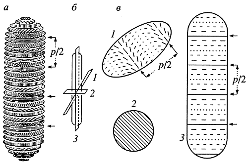 Рис. 4. Схематическое изображение холестерической структуры хромосом простейших (Dinoflagellata), полученное при помощи электронного микроскопаИнтересны данные о состоянии ДНК в половых клетках. В головках спермиев многих млекопитающих (крысы, кролика, жеребца, быка) молекулы ДНК имеют холестерическую упаковку, несмотря на наличие протаминоподобных белков в их составе. В частности, в спектре кругового дихроизма хроматина спермиев быка содержится интенсивная отрицательная полоса, соответствующая холестерической упаковке молекул ДНК. Аналогичная упаковка характерна для спермиев скорпиона, осьминога (Eledone cirrhosa), древесной лягушки (Rhacophoris) и рыб (Scyliorhinus саniculis).а - схема хромосомы, Р/2 - расстояние между двумя светлыми (или темными) полосами на текстуре; б - направление срезов ультратонких слоев хромосомы; в - схема сечения под произвольным углом к длинной оси хромосомы (7), перпендикулярно к ней (2) и вдоль длинной оси (3)
