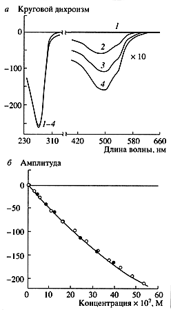 На рис. 5, а приведены спектры кругового дихроизма жидкокристаллических дисперсий ДНК, обработанных дауномицином - окрашенным противоопухолевым антибиотиком антрациклиновой группы. В этих спектрах, кроме отрицательной полосы в области поглощения азотистых оснований ДНК (длина волны около 270 нм), наблюдается дополнительная отрицательная полоса в диапазоне поглощения дауномицина (длина волны около 500 нм). Отрицательный знак однозначно свидетельствует о том, что молекулы дауномицина интеркалируют между парами оснований ДНК. Интересно, что амплитуда полосы на длине волны 270 нм практически не меняется при увеличении концентрации дауномицина в растворе, в то время как амплитуда полосы на длине волны 500 нм прямо пропорциональна концентрации молекул дауномицина, связанных с ДНК. Пользуясь калибровочной зависимостью (рис. 5, б), можно определять концентрацию дауномицина в растворе.