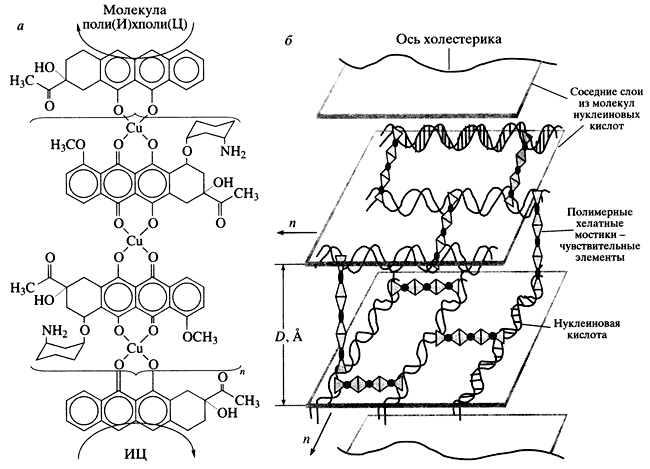 Наиболее просто построить молекулярную конструкцию на основе двухцепочечных полирибонуклеотидов, так как интеркаляция антрациклинов между парами азотистых оснований не нарушает структуру этих молекул. Предложенная нами полимерная хелатная "сшивка" между молекулами поли(И) х поли(Ц), фиксированными в частице жидкокристаллической дисперсии, показана на рис. 6, а. Возникновение полимерных хелатных "сшивок" [ДАУ-Сu2+-ДАУ-Сu2+....ДАУ-Сu2+-ДАУ] между соседними молекулами поли(И) х поли(Ц) приводит к образованию трехмерной молекулярной конструкции (рис. 6, б).