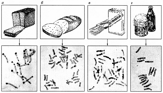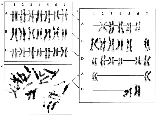 Рис. 1. Кариотипы хлебных злаков а - рожь (14 хромосом), б - твердая пшеница (28 хромосом), в - мягкая пшеница (42 хромосомы), г - ячмень (14 хромосом)В течение многих лет изучаются кариотипы хлебных злаков, прежде всего пшеницы и ржи. Интересно, что у разных видов этих растений число хромосом различно, но всегда кратно семи. Отдельные виды хлебных злаков можно надежно распознать по их кариотипу. Например, геном ржи состоит из семи пар крупных хромосом, имеющих на своих концах интенсивно окрашенные гетерохроматические блоки, часто называемые сегментами, или бэндами (рис. 1, а). Геномы пшеницы насчитывают уже 14 и 21 пару хромосом (рис. 1, б, в), причем распределение в них гетерохроматических блоков не такое, как в хромосомах ржи. Различаются между собой и отдельные геномы пшеницы, получившие обозначение А, В и D. Возрастание числа хромосом с 14 до 21 приводит к резкому изменению свойств пшеницы, что нашло отражение в их названиях: твердая, или макаронная, пшеница и мягкая, или хлебная, пшеница. За приобретение мягкой пшеницей высоких хлебопекарных свойств ответственен геном D, содержащий гены белков клейковины, которая придает тесту так называемую всхожесть. Именно этому геному уделяется особое внимание при селекционном улучшении хлебных пшениц. Другой 14-хромосомный злак - ячмень (рис. 1, г) обычно не используют для приготовления хлеба, однако он служит основным сырьем для изготовления таких распространенных продуктов, как пиво и виски.Интенсивно изучаются хромосомы некоторых дикорастущих растений, используемых для улучшения качества важнейших сельскохозяйственных видов, например диких сородичей пшеницы - эгилопсов [5]. Новые растительные формы создаются путем скрещивания (рис. 2) и отбора. В последние годы значительное усовершенствование методики исследований позволило приступить к изучению геномов растений, особенности кариотипов которых (главным образом мелкие размеры хромосом) делали их ранее недоступными для хромосомного анализа. Так, лишь недавно были впервые идентифицированы все хромосомы хлопка, ромашки и льна [6].