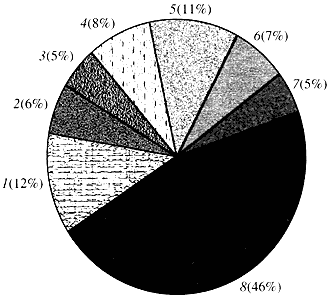 1 - гены роста, деления и синтеза ДНК; 2 - гены синтеза РНК (транскрипция); 3 - гены синтеза и модификации белков; 4 - гены развития, старения и смерти клеток; 5 - гены клеточного метаболизма и энергетического обмена; 6 - гены межклеточного взаимодействия и передачи сигнала; 7 - гены обеспечения прочих клеточных процессов; 8 - гены с неизвестной функциейЧто касается функции генов растений, то мы знаем о них менее одной десятой того, что нам известно о генах человека. Даже у арабидопсиса, геном которого по степени изученности намного превосходит геном человека, функция почти половины его генов остается неизвестной (рис. 4). Между тем у растений, кроме генов, общих с животными, имеется значительное число генов, специфичных только (или, по крайней мере, преимущественно) для них. Речь идет о генах, вовлеченных в транспорт воды и синтез клеточной стенки, отсутствующей у животных, о генах, обеспечивающих образование и функционирование хлоропластов, фотосинтез, фиксацию азота и синтез многочисленных ароматических продуктов. Этот перечень можно продолжить, но уже сейчас ясно, сколь сложная задача стоит перед функциональной геномикой растений.Полное секвенирование генома дает близкие к истинным сведения об общем количестве генов данного организма, позволяет поместить в банки данных более или менее подробные и достоверные сведения об их структуре, облегчает работу по выделению и изучению индивидуальных генов. Однако секвенирование генома отнюдь не означает установления функции всех генов.