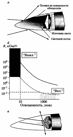 Нанесем на внутреннюю поверхность радиопрозрачного обтекателя полупроводниковую пленку, устроенную таким образом, что под действием оптического или ультрафиолетового облучения она может изменять проводимость на много порядков величины. Тогда, поместив под обтекатель источники оптического излучения (рис. 5, а), мы могли бы в зависимости от нашего желания перевести поверхность обтекателя из состояния, полностью прозрачного для СВЧ, в полностью отражающее состояние, если в результате воздействия источников излучения, которые находятся над обтекателем, проводимость достигнет высокой величины. Металлизированный обтекатель будет отражать падающую на него электромагнитную волну, и его ЭПР для углов наблюдения, отличных от ортогональных к оси самолета, станет низкой. Естественно, что в это время собственный локатор самолета работать не может.