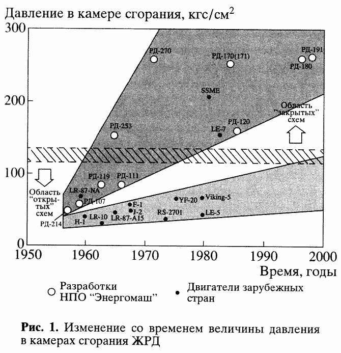 Динамику освоения высоких давлений (рис. 1) и получения максимальных удельных импульсов (рис. 2) можно проследить на примере двигателей, разработанных в НПО "Энергомаш" и за рубежом. Из рисунков видно, что более высокое давление в камерах сгорания российских ЖРД позволяет обеспечить большую степень расширения продуктов сгорания в соплах и, следовательно, повышенные удельные импульсы тяги двигателей. Такие ЖРД установлены практически на всех российских космических ракетах и на многих ракетах стратегического назначения.