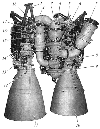 Рис. 6. Двигатель РД-180 1 - рама, 2 - блок газоводов, 3 - выхлопной коллектор турбины, 4 - турбина, 5 - теплообменник, 6 - насос окислителя, 7 - бустерный насосный агрегат окислителя, 8 - насос горючего первой ступени, 9 - насос горючего второй ступени, 10,11- вторая и первая камеры сгорания, 12 - эжектор, 13 -пусковой бачок, 14 - рулевой привод, 15 - гибкие элементы, 16 - бустерный насосный агрегат горючего, 17 - траверса, 18 - разделительный клапан