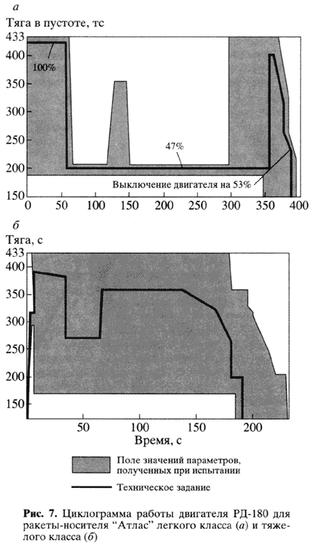 В процессе создания двигатель РД-180 был сертифицирован для использования в ракетах-носителях "Атлас" легкого, среднего и тяжелого классов. Характерные циклограммы работы двигателя, показывающие изменение тяги двигателя во время полета, приведены на рисунке 7. Сегодня такого результата можно достичь, применяя только российские технологии. К настоящему времени успешно осуществлено семь запусков американских ракет-носителей "Атлас" легкого и среднего классов с российскими двигателями РД-180.