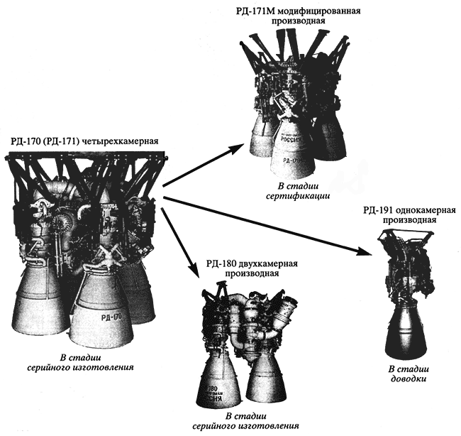 Использование перечисленных достижений в других двигателях повысило их надежность и эффективность. Примером может служить двигатель НПО "Энергомаш" РД-180, имеющий тягу 400 т. Он построен на базе универсальной 200-тонной камеры сгорания и двухзонного газогенератора. Проект этого двигателя был представлен на объявленном в 1995 г. корпорацией "Локхид-Мартин" (США) конкурсе по выбору кислородно-керосинового двигателя для модернизации американской ракеты-носителя "Атлас". Российский проект оказался победителем тендера, продемонстрировав преимущество отечественных двигательных технологий.